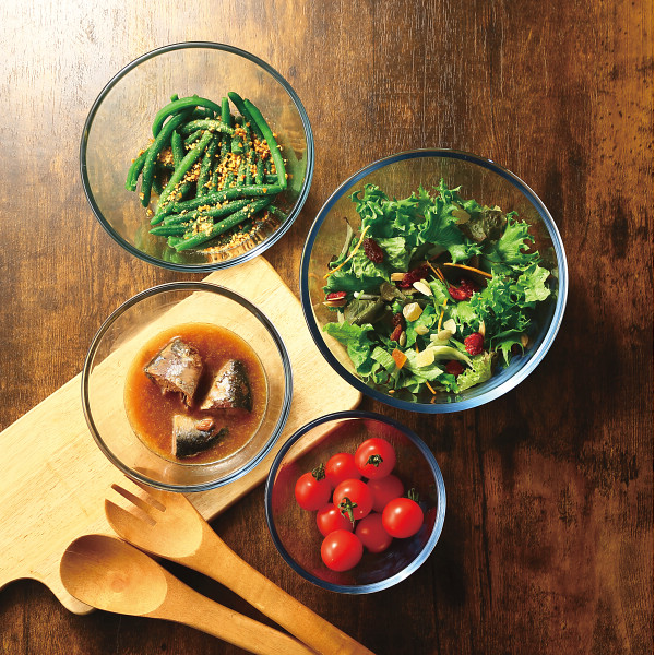 ●ボウル500ml(約12.8φ×7cm・500ml)・ボウル800ml(約15φ×8.1cm・800ml)・ボウル1l(約16.9φ×8.8cm・1l)・ボウル1.5l(約19φ×9.5cm・1.5l)×各1●オーブンレンジ・電子レンジ可